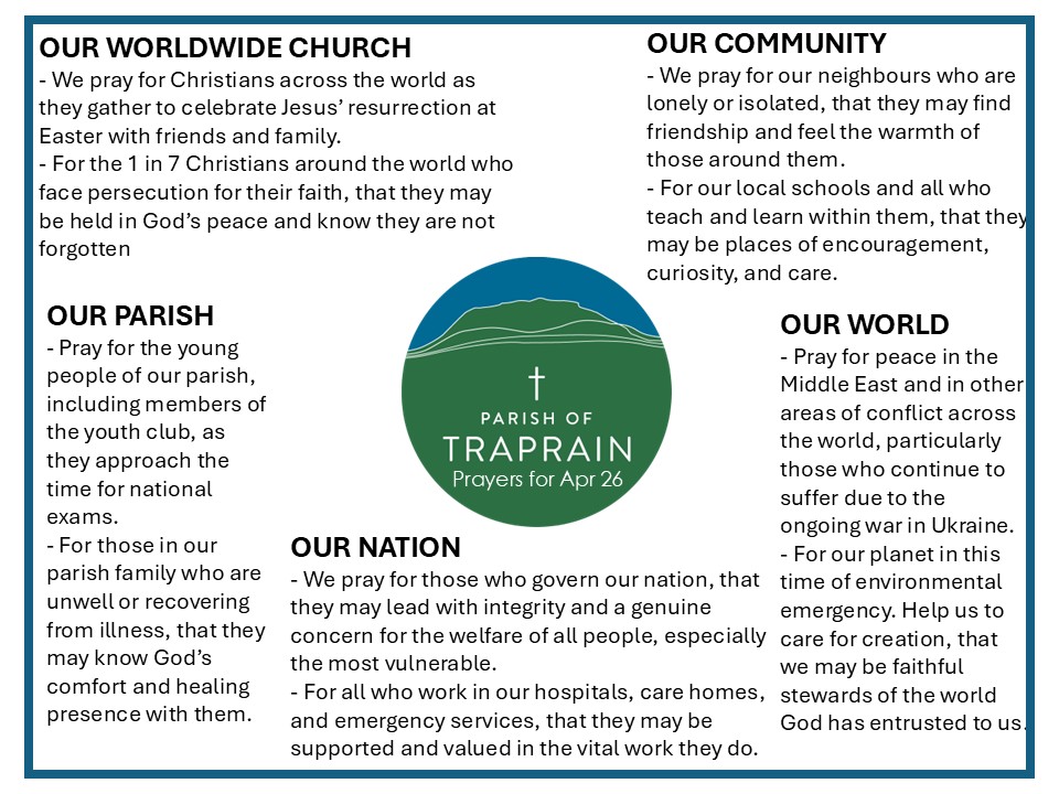 Our latest monthly update, detailing all upcoming services and activities, is available here. You can subscribe to our monthly newsletter by subscribing here. or by contacting admin@parishoftraprain.org.uk