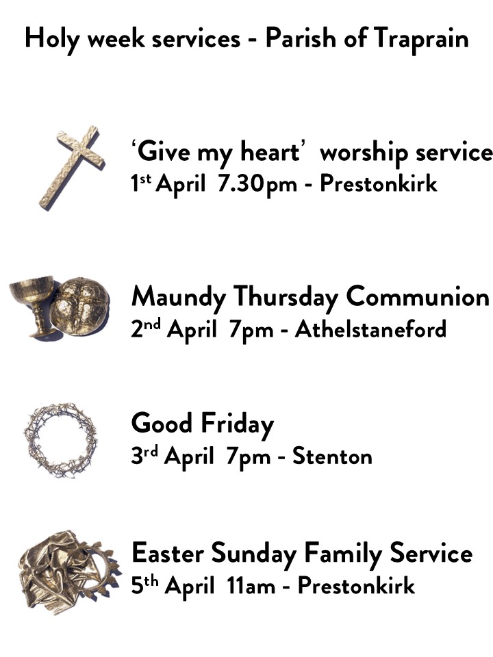Our all age family service at 11am will be at Prestonkirk and there will be an easter egg hunt after the service. It will be great if you are able to join the Easter celebrations!