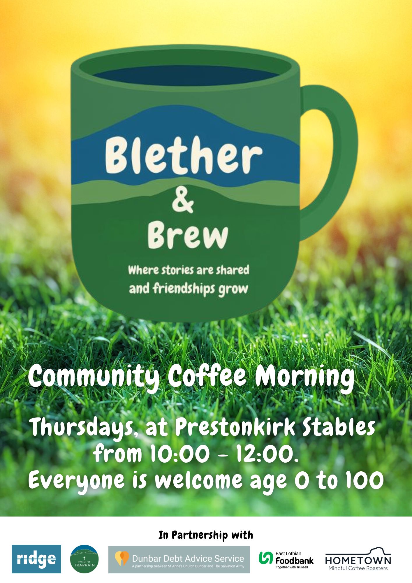 This is a partnership between the Church, The Ridge, Dunbar Debt Advice Service and East Lothian Foodbank. We are also grateful for the coffee supplied by Hometown. Support and advice is freely available and includes: Benefit support, Foodbank, Befriending, Budgeting and Housing Support, Recovery support and access to volunteering and wellbeing services.